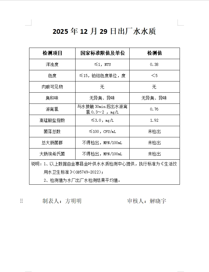 金叶供水有限公司2025年12月29日出厂水水质报告(9项)