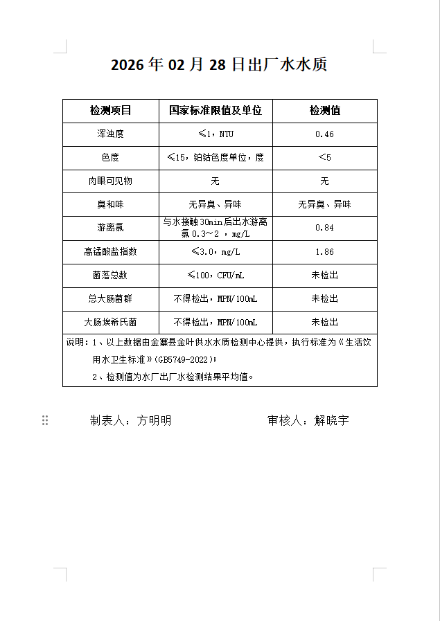 金叶供水有限公司2026年2月28日出厂水水质报告(9项)