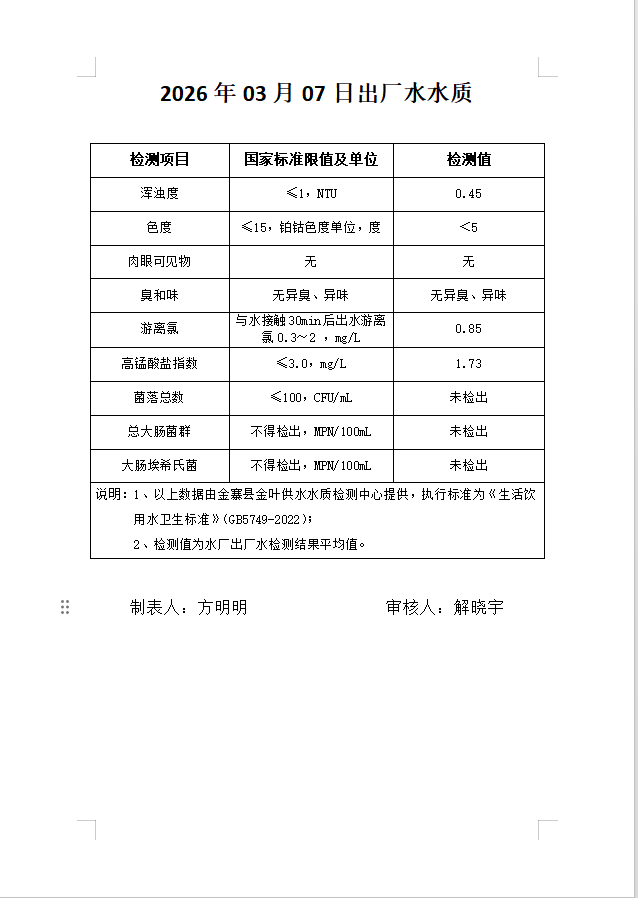 金叶供水有限公司2026年3月7日出厂水水质报告(9项)